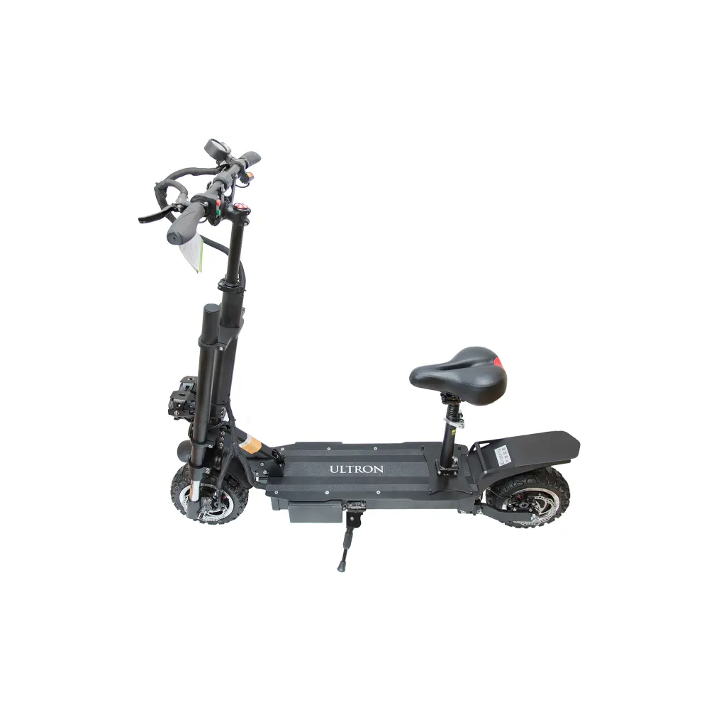 Электросамокат ULTRON T118 с усиленной рулевой стойкой, улучшенной амортизацией может преодолевать любые просторы. Для него не страшны подъемы и не ровная местность. Любители загородных поездок получили возможность передвигаться с комфортом на приличных скоростях. Движение в городе по асфальту доставит вам невероятные впечатления. Полный привод агрегата с мощностью двух двигателей 6000 Вт (по 3000 Вт каждый) позволяет развивать скорость транспорту до 85 км/ч. За счет прочной и надежной конструкции можно уверенно чувствовать себя за рулем такого устройства.