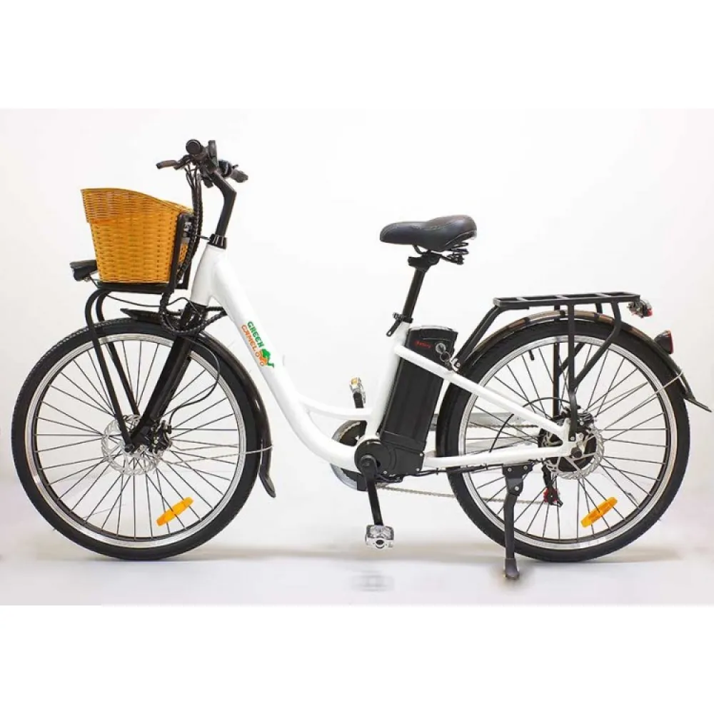 Электровелосипед GreenCamel Бриз (R26 350W 36V 10Ah) Алюм, 6скор – облегченная модель техники весов 22 кг и грузоподъемностью в 110 кг стала хитом продаж наступившего сезона. Первое ознакомление с моделью заявляет, что она создана для слабого пола. Объемная удобная для продуктов корзина, классический белый тон привлекают любителе комфорта и удобства. На самом деле электровелосипед рассчитан на женскую и мужскую категорию. Подтверждением тому являются совершенствованные технические характеристики.